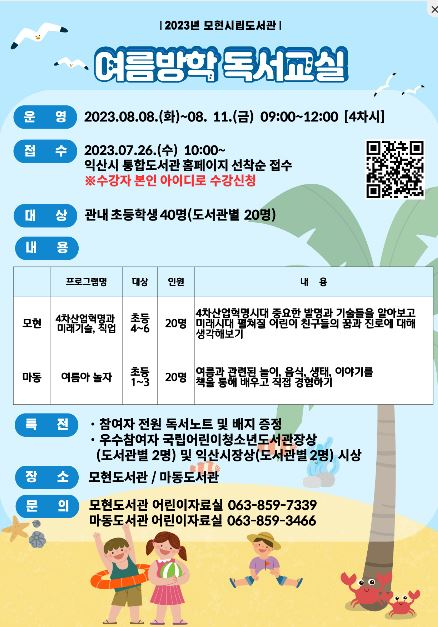 ÀÍ»ê½Ã¸³µµ¼°üÀº ¿©¸§¹æÇÐÀ» ¸ÂÀÌÇÑ ÃʵîÇлýÀ» ´ë»óÀ¸·Î ¡®2023³â ½Ã¸³µµ¼°ü ¿©¸§¹æÇÐ µ¶¼±³½Ç¡¯¼ö°»ýÀ» ¸ðÁýÇÑ´Ù.