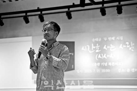 |  | | | ¡è¡è ¼ÛÅÂ±Ô ½ÃÀÎÀÌ µÎ¹øÂ° ½ÃÁý ¡®½Ã°£À» »ç´Â »ç¶÷¡¯ Ãâ°£ ºÏ ÄܼƮ¸¦ 7¿ù 21ÀÏ ¿ÀÈÄ ÀÍ»ê ¿µµîµ¿ ÁÜ °¶·¯¸®¿¡¼ ½ÃÀεé°ú ¹®ÇÐÀ» »ç¶ûÇÏ´Â 200¿© ¸íÀÇ ÃàÇϼӿ¡ °¡Á³´Ù. | | ¨Ï ÀÍ»ê½Å¹® | | 33³âÀÇ ±³Á÷À» ¸¶¹«¸®ÇÏ°í ½ÃÀÎÀÇ ±æÀ» °È´Â ¼ÛÅÂ±Ô ½ÃÀÎÀÌ µÎ ¹øÂ° ½ÃÁý ¡®½Ã°£À» »ç´Â »ç¶÷¡¯(»îâ)À» Æì³Â´Ù.