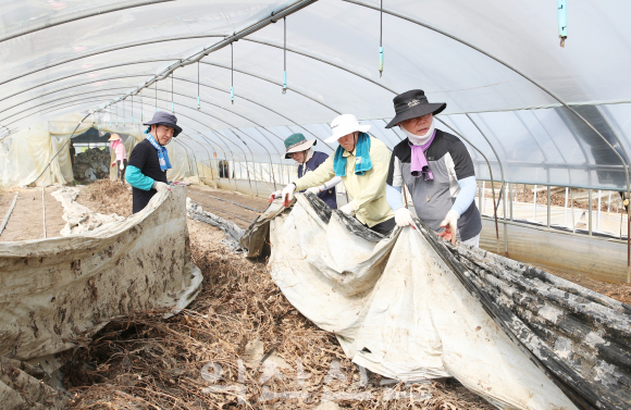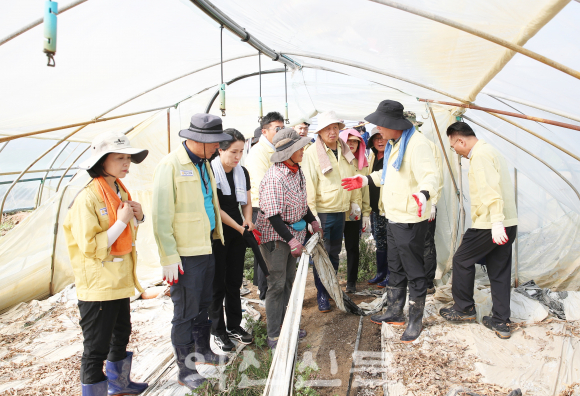 À̳¯ ÃÖÁ¾¿À ÀÇÀ塤Çѵ¿¿¬ ºÎÀÇÀåÀ» ºñ·ÔÇÑ ÀÇ¿øµé°ú ÀÇȸ»ç¹«±¹ Á÷¿ø µî 50¿© ¸íÀº ¿ë¾È¸é ¼®µ¿¸®¿¡ ÀÖ´Â ¼ö¹Ú Àç¹è ³ó°¡¸¦ ã¾Æ ºñ´ÒÇϿ콺 ¾ÈÀÇ ³ÕÄð°ú Åä»ç¹°À» °È¾î³»°í Åä¾çÀ» µ¤°í ÀÖ´ø ºñ´ÒÀ» ¼ö°ÅÇÏ´Â µî ¼öÇØº¹±¸¸¦ µµ¿ì¸ç ±¸½½¶¡À» Èê·È´Ù.