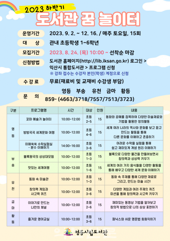 ÀÍ»ê½Ã¸³µµ¼°üÀº ÇлýµéÀÇ µ¶¼ ½À°ü Çü¼º°ú ´Ù¾çÇÑ Ã¢ÀÇ‧üÇè ±âȸ¸¦ Á¦°øÇϱâ À§ÇØ ÇϹݱ⠵¶¼¡¤¹®ÈÇÁ·Î±×·¥À» ¿î¿µÇÑ´Ù.