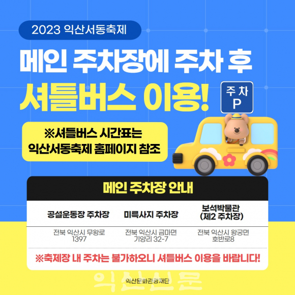 ÀÍ»ê½Ã´Â ¼µ¿ÃàÁ¦ÀåÀ» ¿À°¡´Â ¹«·á ¼ÅƲ¹ö½º¸¦ Áö³Çغ¸´Ù 1.5¹è ÁõÂ÷ÇÏ°í ³ë¼±À» È®ÃæÇØ ÃàÁ¦ ÇöÀåÀÇ ±³Åë³À» Àü°Ý ÇØ¼ÒÇÏ°í ½Ã¹Î°ú ¹æ¹®°´µéÀÇ ¾ÈÀü°ú ÆíÀǸ¦ Á¦°øÇÑ´Ù°í ÀÌ´Þ 7ÀÏ ¹àÇû´Ù.