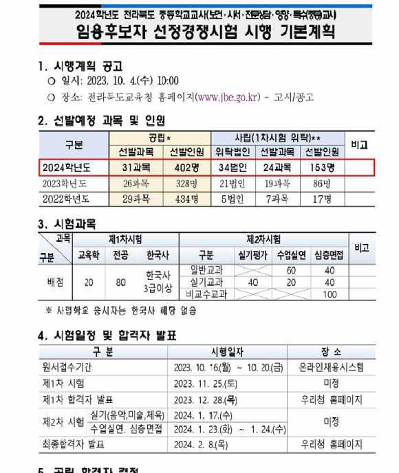 ÀüºÏµµ±³À°Ã»(±³À°°¨ ¼°Å¼®)Àº ¡®2024Çг⵵ ÁßµîÇб³±³»ç, º¸°Ç¡¤»ç¼¡¤Àü¹®»ó´ã¡¤¿µ¾ç¡¤Æ¯¼ö(Áßµî)±³»ç ÀÓ¿ëÈĺ¸ÀÚ ¼±Á¤ °æÀï½ÃÇè ½ÃÇà°èȹ¡¯À» 4ÀÏ µµ±³À°Ã» ´©¸®Áý(www.jbe.go.kr)¿¡ °ø°íÇß´Ù.