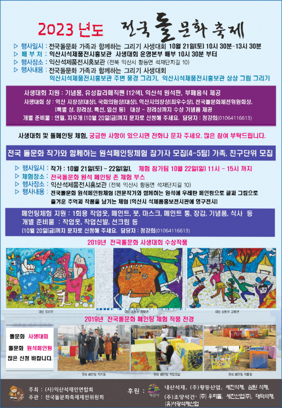 Àͻ꼮À» »ç¿ëÇÑ °¡Á·°ú ´Üü µî ÆäÀÎÆÃ Ã¼Çè, À¯Ä¡¿ø»ý ¹× ÃʵîÇлýÀ» ´ë»óÀ¸·Î ÀÍ»ê ¼®Àç¿¡ ´ëÇÑ Ã¢ÀÇÀûÀÎ »ý°¢À» µ¹ÆÇ¿¡ Ç¥ÇöÇÒ ¼ö ÀÖ´Â µ¹¹®È ±×¸®±â »ç»ý´ëȸ µîÀÌ ÁøÇàµÈ´Ù.