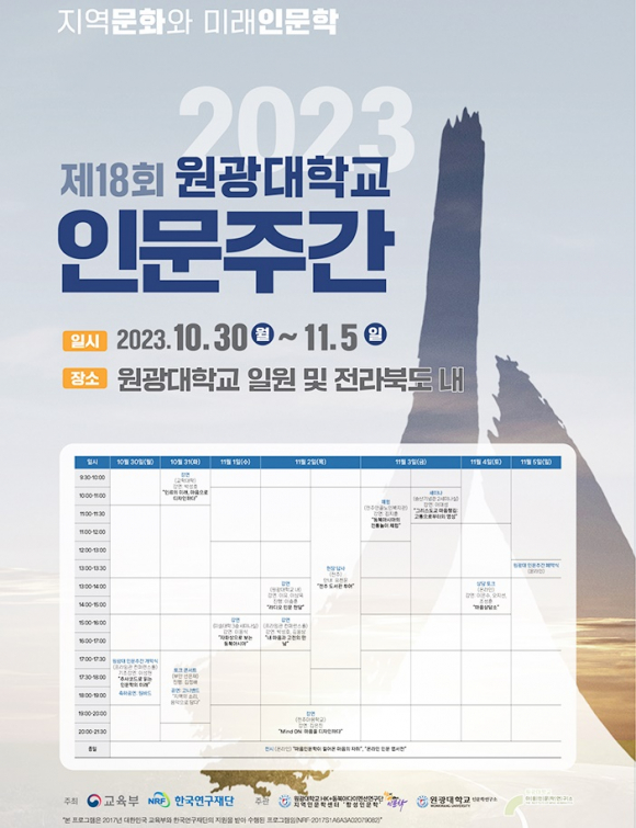 ¿ø±¤´ëÇб³(ÃÑÀå ¹Ú¼ºÅÂ) HK+µ¿ºÏ¾Æ½Ã¾ÆÀι®»çȸ¿¬±¸¼Ò Áö¿ªÀι®Çм¾ÅÍ(ÀÌÇÏ HK+Áö¿ªÀι®Çм¾ÅÍ)¿Í ¸¶À½Àι®Çבּ¸¼Ò´Â ¡®Áö¿ª¹®È¿Í ¹Ì·¡ Àι®ÇС¯, ¡®ÀηùÀÇ ¹Ì·¡, ¸¶À½À¸·Î µðÀÚÀÎÇÏ´Ù¡¯¸¦ ÁÖÁ¦·Î °¢°¢ Á¦18ȸ Àι®ÁÖ°£ Çà»ç¸¦ ÁøÇàÇÑ´Ù.