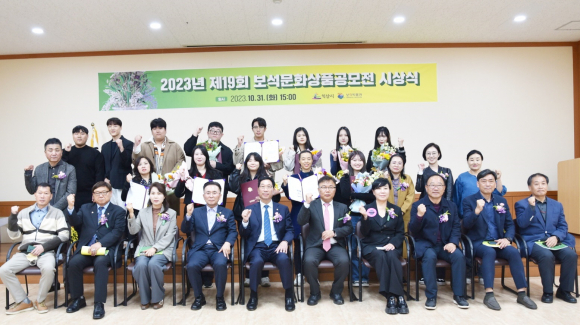 ÀÍ»ê½Ã ÁÖÃÖ¡¤º¸¼®¹Ú¹°°üÀÌ ÁÖ°ü ¡®2023 Á¦19ȸ º¸¼®¹®È»óǰ°ø¸ðÀü¡¯ ½Ã»ó½Ä°ú ¼ö»óÀÛǰ Àü½Ãȸ°¡ 10¿ù 31ÀÏ ¿Õ±Ã¸é º¸¼®¹Ú¹°°ü¿¡¼ ¼ö»óÀÚ ¹× °¡Á· µî ¾à 60¿©¸íÀÌ Âü¼®ÇÑ °¡¿îµ¥ °³ÃֵƴÙ.