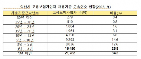 °í¿ëº¸Çè °¡ÀÔÀÚ Ã¤¿ë±âÁØ ±Ù¼Ó ¿¬¼ö ÇöȲÀº 1³â ¹Ì¸¸ÀÌ 34.2%·Î °¡Àå ³ô¾Ò°í, ´ÙÀ½Àº 1³â~3³âÀ¸·Î Á¶»çµÆ´Ù.