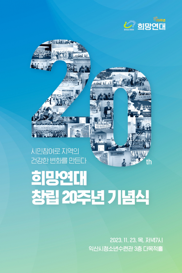 ÀÍ»êÈñ¸Á¿¬´ë(·ùÁ¾ÀÏ¡¤ÃÖº´Ãµ °øµ¿´ëÇ¥) ⸳ 20Áֳ⠱â³ä½ÄÀÌ ¿À´Â 23ÀÏ ¿ÀÈÄ 7½Ã ¾î¾çµ¿ ÀÍ»ê½Ãû¼Ò³â¼ö·Ã°ü ´Ù¸ñÀûȦ¿¡¼ °³ÃֵȴÙ.