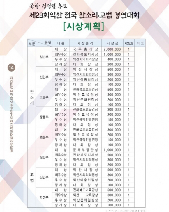 |  | | | ¨Ï ÀÍ»ê½Å¹® | | ´ëȸ »ó±ÝÀº ÆÇ¼Ò¸® ÀϹݺÎÀÇ °æ¿ì ´ë»ó(±¹¹«ÃѸ®»ó) 200¸¸¿ø, ÃÖ¿ì¼ö»ó(ÀüºÏµµÁö»ç»ó) 100¸¸¿ø, ¿ì¼ö»ó(ÀÍ»ê½ÃÀÇȸÀÇÀå»ó) 40¸¸¿ø Àå·Á»ó 20¸¸¿ø(´ëȸÀå»ó)À̰í, °í¹ý ÀϹݺÎÀÇ °æ¿ì ´ë»ó(¹®Ã¼ºÎÀå°ü»ó) 100¸¸¿ø, ÃÖ¿ì¼ö»ó(ÀüºÏµµÁö»ç»ó) 50¸¸¿ø, ¿ì¼ö»ó(ÀÍ»ê½ÃÀÇȸÀÇÀå»ó) 30¸¸¿ø, Àå·Á»ó(´ëȸÀå»ó) 20¸¸¿ø µîÀÌ´Ù.