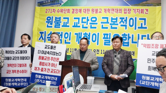 Àç°¡±³µµÈ¸ÀÇ¡¤±Ý°ÀÇÁÖÀΡ¤¿øÆòȱ³´ÜÇõ½ÅƯÀ§¡¤ÆÇ±³¼±¹æ±³µµÈ¸¡¤±³´Ü°³Çõ¿øÄ£È¸¡¤¿øºÒ±³¸ð¿øÈ¸ µî 6°³ ´Üü·Î ±¸¼ºµÈ ¿øºÒ±³ °³Çõ¿¬´ë´Â ÀÌ´Þ 21ÀÏ ÀÍ»ê½Ãû ±âÀڽǿ¡¼ Á¦271Â÷ ¼öÀ§´ÜÀ§ °áÁ¤¿¡ ´ëÇÑ ÀÔÀåÀ» ¹àÈ÷´Â ±âÀÚȸ°ßÀ» °¡Á³´Ù.