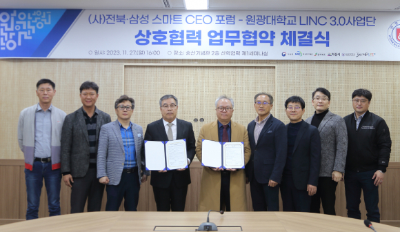 ÇÑÆí, ¿ø±¤´ë LINC 3.0»ç¾÷´ÜÀº À̳¯ ÀÍ»ê½Ãµµ½Ã°ü¸®°ø´Ü Çù¾à¿¡ À̾î (»ç)ÀüºÏ¡¤»ï¼º ½º¸¶Æ® CEO Æ÷·³°úµµ Á¤Ã¶¿µ ȸÀå°ú ¹®¼ºÈ£ ºÎȸÀåÀ» ºñ·ÔÇÑ °ü°èÀÚµéÀÌ Âü¼®ÇÑ °¡¿îµ¥ »óÈ£Çù·Â ¾÷¹«Çù¾àÀ» ü°áÇß´Ù.