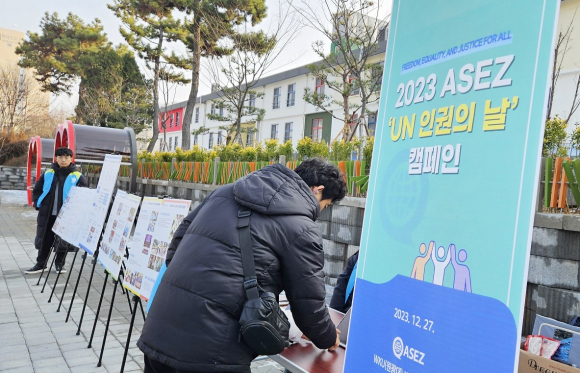 ¿ÃÇØ·Î ¡®¼¼°è ÀαÇÀÇ ³¯¡¯ÀÌ 75ÁÖ³âÀ» ¸ÂÀº °¡¿îµ¥ Çϳª´ÔÀDZ³È¸ ¼¼°èº¹À½¼±±³Çùȸ(ÃÑȸÀå ±èÁÖö ¸ñ»ç¡¤ÀÌÇÏ Çϳª´ÔÀÇ ±³È¸) ´ëÇлýºÀ»ç´Ü ASEZ°¡ 12¿ù 27ÀÏ ¿ø±¤´ëÇб³ ´ëÇзο¡¼ ¡®ASEZ ÀαÇÀÇ ³¯ Ä·ÆäÀΡ¯À» ¿¾î ¡®¼¼°è ÀαÇÀÇ ³¯¡¯À» ¾Ë¸®°í ÀαÇÀÇ Á߿伺À» ȯ±âÇß´Ù.