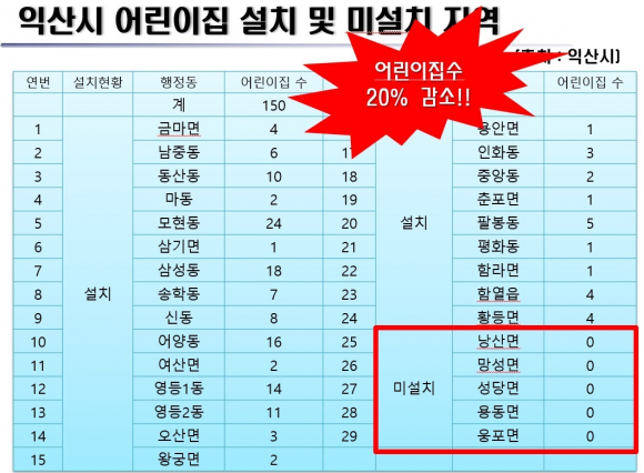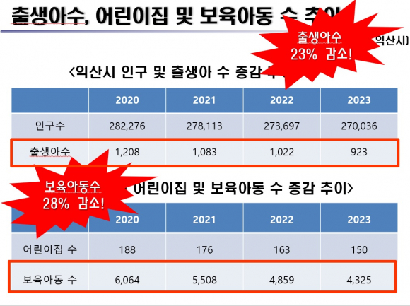 ¿ÀÀÓ¼± ÀÇ¿øÀº ¡°ÀÍ»êÁö¿ª 2020³â ÇÑÇØ Ãâ»ý¾Æ¼ö´Â 1,208¸íÀ̾úÀ¸³ª 2023³â 923¸íÀ¸·Î 23%³ª ÁÙ¾ú°í, º¸À°¾Æµ¿¼ö´Â 6,064¸í¿¡¼ 4,325¸íÀ¸·Î 28% ÀÌ»ó °¨¼ÒÇØ ¿µÀ¯¾Æ¼ö °¨¼Ò ÁöÇ¥´Â ÈξÀ ½É°¢ÇÏ´Ù¡±°í ¹àÈùµÚ¡°ÀÌ¿Í ¸Â¹°·Á ¾î¸°ÀÌÁýµµ 2020³â 188°³¼Ò¿¡¼ 2023³â 150°³¼Ò·Î 20% ÀÌ»ó °¨¼ÒÇß´Ù¡±°í ¼³¸íÇß´Ù.