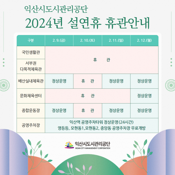 ¹è»ê½Ç³»Ã¼À°°ü°ú Á¾ÇտÀåÀÇ °æ¿ì ¼³ ´çÀÏÀÎ 10ÀÏÀ» Á¦¿ÜÇÏ°í ¸ðµÎ Á¤»ó ¿î¿µµÇ¸ç Àͻ깮ÈüÀ°¼¾ÅÍ´Â ¿¬ÈÞ ¸¶Áö¸·³¯ÀÎ 12Àϸ¸ ¿î¿µµÈ´Ù.