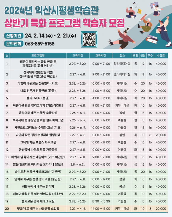 ÀÍ»ê½Ã¹ÎÀ̶ó¸é ´©±¸³ª Âü¿©ÇÒ ¼ö ÀÖÀ¸¸ç, ÀÍ»ê½Ã Æò»ýÇнÀ°ü ´©¸®ÁýÀ» ÅëÇØ Á¢¼öÇÏ¸é µÈ´Ù. ÀÚ¼¼ÇÑ »çÇ×Àº ÀÍ»ê½ÃÆò»ýÇнÀ°ü ´©¸®ÁýÀ» Âü°íÇϰųª ÀüÈ(063-859-5158)·Î ¹®ÀÇÇÏ¸é µÈ´Ù.