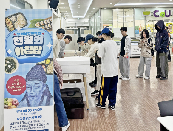 3¿ù 23ÀÏ ½Ã¿¡ µû¸£¸é ¿øÀÇ ¾ÆÄ§¹ä »ç¾÷Àº ½Ò ¶Ç´Â ½Ò°¡°ø ½ÄǰÀ» Ȱ¿ëÇÑ ¾ÆÄ§ ½Ä»ç¸¦ ¿ø±¤´ë¿Í ¿ø±¤º¸°Ç´ë Çлýµé¿¡°Ô 1,000¿ø¿¡ Á¦°øÇÏ´Â °ÍÀ¸·Î ÇлýµéÀÇ °Ç°À» µµ¸ðÇÏ°í ½Ò ¼Òºñ ÃËÁø¿¡µµ ±â¿©ÇÏ·Á´Â ÃëÁö´Ù.