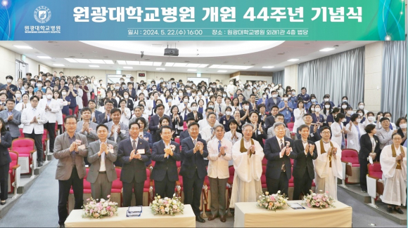¿ø±¤´ëÇб³º´¿ø(º´¿øÀå ¼ÀÏ¿µ)´Â °³¿ø Á¦44Áֳ⠱â³ä½ÄÀ» 5¿ù 22ÀÏ ¿Ü·¡1°ü 4Ãþ ´ë°´ç¿¡¼ ±è°ü¿µ ÀüºÏƯº°ÀÚÄ¡µµÁö»ç¡¤Á¤ÇåÀ² ÀÍ»ê½ÃÀåÀ» ºñ·Ô ¿ÀµµÃ¶ (ÇÐ)¿ø±¤Çпø »óÀÓÀÌ»ç, ¹Ú¼ºÅ ¿ø±¤´ëÇб³ ÃÑÀå, ¼ÀÏ¿µ º´¿øÀå ¹× ´ë³»¡¤¿Ü ÁÖ¿ä Àλçµé°ú º¸Á÷ÀÚ, ±³Á÷¿ø 400¿© ¸íÀÌ Âü¼®ÇÑ °¡¿îµ¥ °®°í ÀÚÃàÇÏ´Â ÇÑÆí ´ëÇѹα¹ ÀÇ·áÁß½ÉÀ¸·Î µµ¾àÀ» ´ÙÁüÇß´Ù.