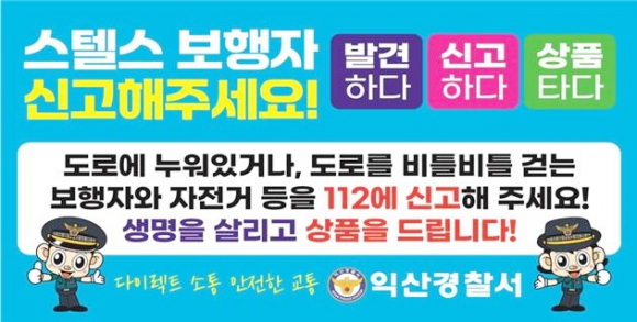 ÀÍ»ê°æÂû¼´Â ½ºÅÚ½º º¸ÇàÀÚ »ç°í¸¦ ¿¹¹æÇϱâ À§ÇØ Àϸô ÈÄ ¼øÂû Ȱµ¿À» °ÈÇϰí, °øµ¿Ã¼ Çù·Â Ä¡¾È ÀÏȯÀ¸·Î ½Ã¹ÎµéÀÇ 112 ½Å°í¸¦ ¹Þ¾Æ ½ºÅÚ½º º¸ÇàÀÚ¿¡ ´ëÇÑ ¾ÈÀüÁ¶Ä¡¸¦ ½Ç½ÃÇϱâ·Î Çß´Ù.