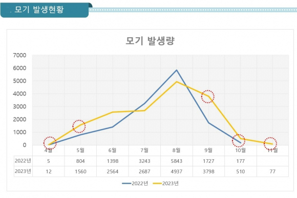 ¶Ç ¡°Áúº´°ü¸®Ã»ÀÇ ¹ßÇ¥ÀÚ·á¿¡ µû¸£¸é ÃÖ±Ù 3³â°£ ÀÌ»ó°í¿Â Çö»óÀ¸·Î 4¿ùºÎÅÍ ¸ð±â°¡ ¹ß»ýÇØ Ȱµ¿±â°£ÀÌ 11¿ù±îÁö À̾îÁö°í ÀÖ´Ù¡±°í ¼³¸íÇß´Ù.