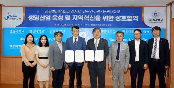 ¿ø±¤´ëÇб³(ÃÑÀå ¹Ú¼ºÅÂ)¿Í ÀüºÏ¿¬±¸¿ø(¿øÀå À̳²È£)ÀÌ Áö³ 8ÀÏ ±Û·ÎÄôëÇÐ30°ú ¿¬°èÇÑ »ý¸í»ê¾÷ À°¼º ¹× Áö¿ªÇõ½Å ÃßÁøÀ» À§ÇÑ ¾÷¹«Çù¾àÀ» ü°áÇß´Ù.