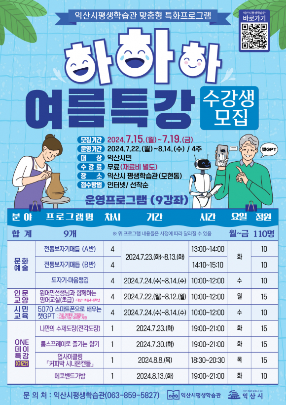 ÀÍ»ê½ÃÆò»ýÇнÀ°üÀÌ ´Ù¾çÇÑ Æò»ý±³À° ±âȸ¸¦ Á¦°øÇϱâ À§ÇØ 7¿ù 22ÀϺÎÅÍ 8¿ù 14ÀϱîÁö ¡®ÇÏÇÏÇÏ ¿©¸§ÇÐ±â Æ¯È ÇÁ·Î±×·¥¡¯À» ¿î¿µÇÑ´Ù.