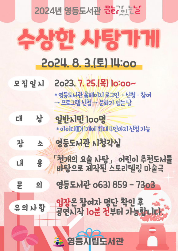 Âü¿© ½ÅûÀº ¿À´Â 25ÀÏ ¿ÀÀü 10½ÃºÎÅÍ ¿µµîµµ¼°ü ´©¸®Áý(lib.iksan.go.kr/yd)À» ÅëÇØ ÁøÇàÇÏ°í ¾î¸°À̸¦ Æ÷ÇÔÇØ ½Ã¹Î 100¸íÀ» ¼±Âø¼øÀ¸·Î ¸ðÁýÇÑ´Ù.