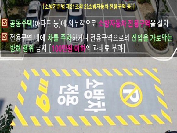 ¼Ò¹æÂ÷ Àü¿ë±¸¿ª ¹æÇØ ÇàÀ§ ±âÁØÀº ¡âÀü¿ë±¸¿ª ¹× ±×ÀÇ ¾Õ¸é, µÞ¸é ¶Ç´Â ¾ç Ãø¸é¿¡ ¹°°Ç µîÀ» ½×°Å³ª ÁÖÂ÷ÇÏ´Â ÇàÀ§ ¡âÁøÀԷο¡ ¹°°Ç µîÀ» ½×°Å³ª ÁÖÂ÷ÇØ ÁøÀÔÀ» °¡·Î¸·´Â ÇàÀ§ ¡â³ë¸é Ç¥Áö¸¦ Áö¿ì°Å³ª ÈѼÕÇÏ´Â ÇàÀ§ µîÀÌ ÀÖÀ¸¸ç À§¹Ý ½Ã 100¸¸ ¿ø ÀÌÇÏÀÇ °úÅ·ᰡ ºÎ°úµÈ´Ù.