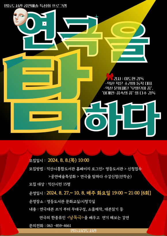 ¸ðÁý ´ë»óÀº ÀÍ»ê½Ã¹Î 15¸íÀ̸ç Âü°¡ÀÚµéÀº ´ëº» ÀÛ¼º, ¼Òǰ Á¦ÀÛ, ¹«´ë ±¸¼º, ´ëº» Àбâ, ¿¬±â µîÀ» ÅëÇØ ³¶µ¶±Ø¿¡ ´ëÇØ ¹è¿ì°Ô µÈ´Ù.