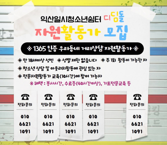 Àü¹®ÀÚ¿øÈ°µ¿°¡ ¸ðÁý¿¡ °üÇÑ ÀÚ¼¼ÇÑ »çÇ×Àº ÀÍ»êÀϽÃû¼Ò³â½°ÅÍ¡®µðµõµ¹¡¯ SNS(ÀνºÅ¸±×·¥¡¤ÆäÀ̽ººÏ)¸¦ Âü°íÇϰųª ÀüÈ(¢Ï 010-6621-1091)¸¦ ÅëÇØ ¹®ÀÇÇÏ¸é µÈ´Ù.
