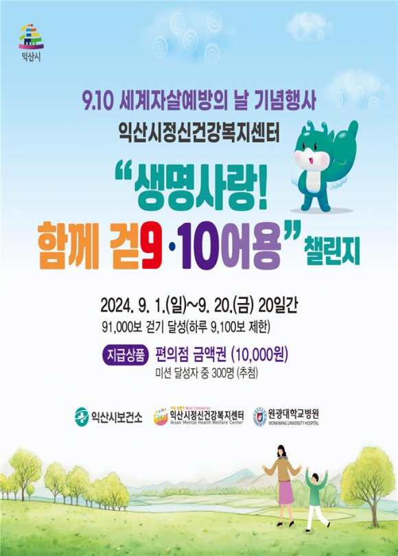 ÀÍ»ê½ÃÁ¤½Å°Ç°º¹Áö¼¾ÅÍ(¼¾ÅÍÀå ¾çÂù¸ð)´Â ´ÙÀ½´Þ 1ÀϺÎÅÍ 20ÀϱîÁö ¡®»ý¸í»ç¶û! ÇÔ²² °È9¡¤10¾î¿ë(°È±¸½Í¾î¿ë)¡¯ 縰Áö¸¦ ÁøÇàÇÑ´Ù.縰Áö ±â°£ ¸ð¹ÙÀÏ ¾Û ¡®¿öÅ©¿Â¡¯À» ÀÌ¿ëÇØ 9¸¸ 1000º¸ °È±â(ÇÏ·ç 9100º¸ Á¦ÇÑ)¸¦ ´Þ¼ºÇÏ¸é µÈ´Ù. ¸ñÇ¥ °ÉÀ½À» ´Þ¼ºÇÑ Âü¿©ÀÚ Áß Ãß÷À» ÅëÇØ 300¸íÀ» ¼±Á¤ÇÏ°í ¸ð¹ÙÀÏ »óǰ±ÇÀ» Áö±ÞÇÑ´Ù.