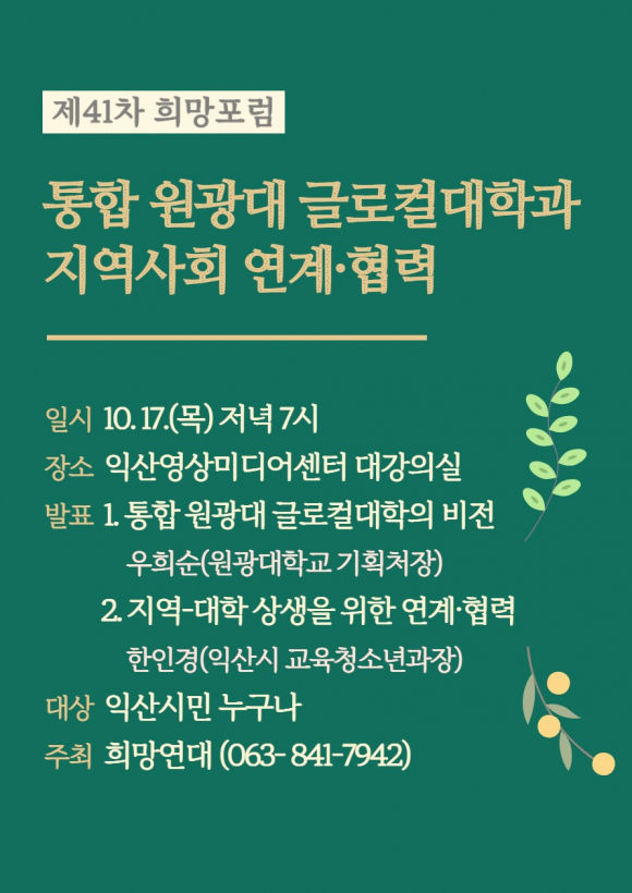 Æ÷·³ Âü¼®Àº ÀÍ»ê Èñ¸Á¿¬´ë ȨÆäÀÌÁö³ª ÀüÈ·Î ½ÅûÇÒ ¼ö ÀÖÀ¸¸ç, ÀÚ¼¼ÇÑ »çÇ×Àº ÀÍ»ê Èñ¸Á¿¬´ë(¢Ï 063-841-7942)·Î ¹®ÀÇÇÏ¸é ¾È³»¹ÞÀ» ¼ö ÀÖ´Ù./È«µ¿±â ±âÀÚ