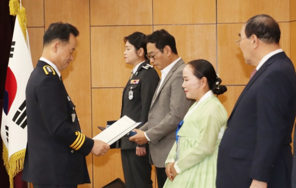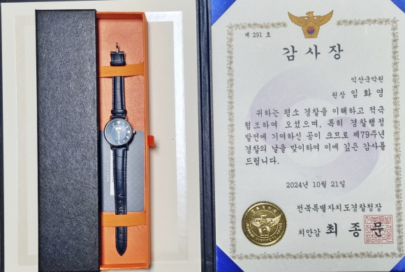 ÀüºÏ°æÂûûÀåÀÇ °¨»çÀå°ú ºÎ»ó ½Ã°è´Â ÀÌ´Þ 21ÀÏ ÀÍ»ê°æÂû¼¿¡¼ ¿¸° °æÂûÀÇ ³¯ ±â³äÇà»ç¿¡¼ °í¿µ¿Ï ÀÍ»ê°æÂû¼ÀåÀÌ ´ë½Å Àü´Þ ¼ö¿©Çß´Ù.