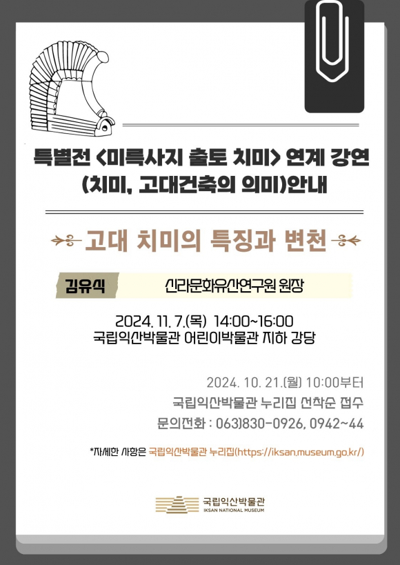 À̹ø °¿¬Àº Áö¿ª¹Î ´ë»óÀ¸·Î ÀÌ·ïÁö¸ç, 11¿ù 7ÀÏ¿¡´Â ±èÀ¯½Ä ½Å¶ó¹®ÈÀ¯»ê¿¬±¸¿ø ¿øÀåÀÌ °í´ë Ä¡¹ÌÀÇ Æ¯Â¡°ú º¯ÃµÀ» ÁÖÁ¦·Î °¿¬ÇÑ´Ù.