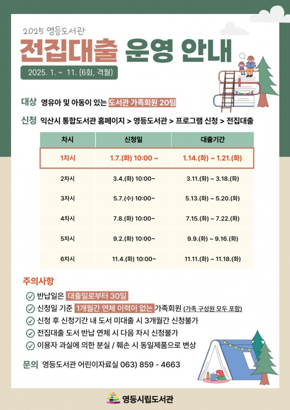 1ȸ ÀüÁý ´ëÃâ ½ÅûÀº ÀÌ´Þ 7ÀϺÎÅÍ ÀÍ»ê½Ã ¿µµîµµ¼°ü ´©¸®Áý(lib.iksan.go.kr/yd) 'ÀüÁý´ëÃâ' ¸Þ´º¿¡¼ ¿øÇÏ´Â ÀüÁýÀ» °ñ¶ó ½ÅûÇÏ¸é µÈ´Ù.