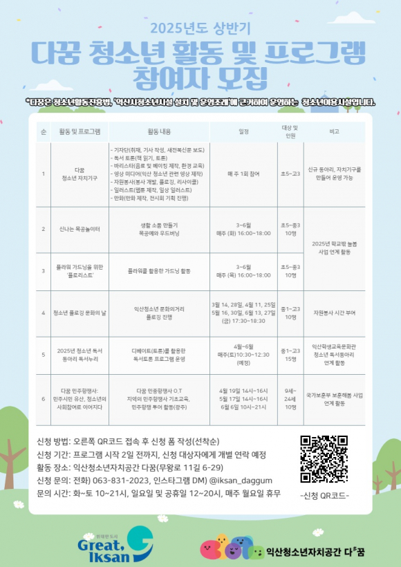 ÇÁ·Î±×·¥ ¹× ÀÚÄ¡±â±¸(µ¿¾Æ¸®) Ȱµ¿ ½ÅûÀ» ¿øÇϴ û¼Ò³âÀº À¥Æ÷½ºÅÍÀÇ Å¥¾ËÄÚµå¿Í ÀüÈ(063-831-2023)¸¦ ÅëÇØ Á¢¼ö°¡ °¡´ÉÇÏ´Ù.