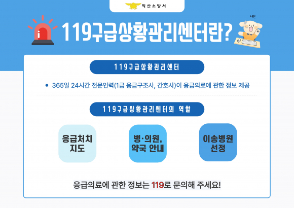 ÀÍ»ê¼Ò¹æ¼¿¡ µû¸£¸é 119±¸±Þ»óȲ°ü¸®¼¾ÅÍ´Â ÀÀ±ÞÀÇ·á¿¡ °üÇÑ Á¤º¸¸¦ È¿À²ÀûÀ¸·Î Á¦°øÇϰíÀÚ °£È£»ç¡¤1±Þ ÀÀ±Þ±¸Á¶»ç µî Àü¹®ÀÚ°ÝÀ» °®Ãá ÀηÂÀÌ 24½Ã°£ »óÁÖÇØ ÀÀ±Þóġ Áöµµ, º´¡¤ÀÇ¿ø ¹× ¾à±¹ ¾È³», ±¸±Þ´ë¿øÀÇ º´¿ø ¼±Á¤ µîÀ» ¼öÇàÇÑ´Ù.