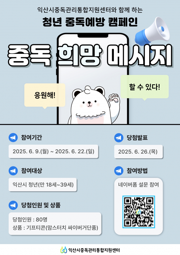 ÀÍ»ê½Ã´Â ÀÍ»ê½ÃÁßµ¶°ü¸®ÅëÇÕÁö¿ø¼¾ÅÍ(¼¾ÅÍÀå ÀÌÇö±â)¿Í ÇÔ²² û³â Áßµ¶ ¿¹¹æ°ú ȸº¹À» ÀÀ¿øÇÏ´Â 'Áßµ¶ Èñ¸Á ¸Þ½ÃÁö' Ä·ÆäÀÎÀ» ¿À´Â 22ÀϱîÁö ÁøÇàÇÑ´Ù°í 9ÀÏ ¹àÇû´Ù.