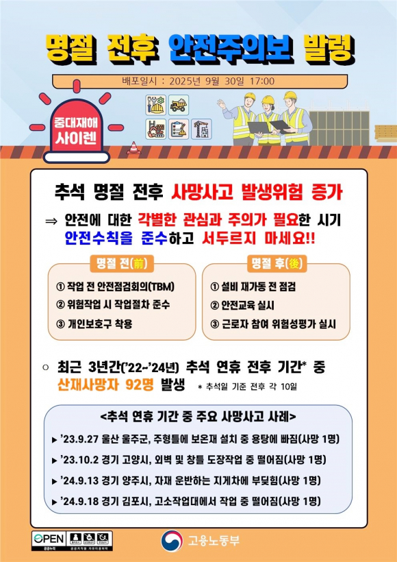 ÀüÇöö ÁöûÀåÀº ¡°ÃÖ±Ù 3³â°£ Ãß¼® ¿¬ÈÞ ÀüÈÄ ±â°£¿¡¸¸ »ê¾÷ÀçÇØ·Î 92¸íÀÇ »ç¸ÁÀÚ°¡ ¹ß»ýÇÏ´Â µî Æò¼Òº¸´Ù Áß´ëÀçÇØ°¡ Áõ°¡ÇÏ´Â °æÇâÀÌ ÀÖ¾î ¾ÈÀü¿¡ ´ëÇÑ °¢º°ÇÑ °ü½É°ú ÁÖÀǰ¡ ÇÊ¿äÇÏ´Ù¡±¸ç ¡°¸ðµç À§¹Ý»çÇ׿¡ ´ëÇØ Áï½Ã »ç¹ýÁ¶Ä¡ÇÏ´Â µî ±âº» ¾ÈÀü¼öÄ¢ À§¹Ý¿¡ ´ëÇØ¼´Â ¾öÁßÇÏ°Ô Á¶Ä¡Çϰڴ١±°í °Á¶Çß´Ù./È«µ¿±â ±âÀÚ