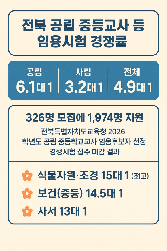 ÀüºÏƯº°ÀÚÄ¡µµ±³À°Ã»Àº 2026Çг⵵ °ø¸³ ÁßµîÇб³±³»ç, º¸°Ç¡¤»ç¼¡¤Àü¹®»ó´ã¡¤¿µ¾ç¡¤Æ¯¼ö(Áßµî)±³»ç ÀÓ¿ëÈĺ¸ÀÚ ¼±Á¤°æÀï½ÃÇè ÀÀ½Ã¿ø¼ Á¢¼ö ¸¶°¨ °á°ú¸¦ 22ÀÏ ´©¸®ÁýÀ» ÅëÇØ °ø°³Çß´Ù.