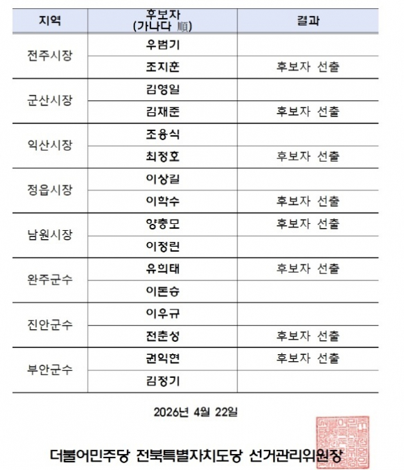 ¹ÎÁÖ´ç ÀüºÏƯº°ÀÚÄ¡µµ´ç ¼±°Å°ü¸®À§¿øÈ¸´Â ÀÌ´Þ 22ÀÏ ¿ÀÀü ÀüºÏµµÀÇȸ ºê¸®Çη뿡¼ ±âÀÚȸ°ßÀ» ¿°í ÀÍ»ê½Ã¸¦ Æ÷ÇÔÇÑ 8°³ Áö¿ª ±âÃÊ´ÜüÀå °á¼± °á°ú¸¦ ¹ßÇ¥Çß´Ù.