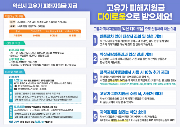 |  | | | ¨Ï ÀÍ»ê½Å¹® | | ÀÍ»ê½Ã°¡ °íÀ¯°¡·Î ÀÎÇÑ ½Ã¹ÎµéÀÇ °æÁ¦Àû ºÎ´ãÀ» ´ú±â À§ÇØ ¡®°íÀ¯°¡ ÇÇÇØÁö¿ø±Ý¡¯À» Áö¿ª»ç¶û»óǰ±ÇÀÎ ¡®´ÙÀ̷οò¡¯À¸·Î Áö±ÞÇϸç Áö¿ª °æÁ¦ Ȱ¼ºÈ¿¡ ³ª¼±´Ù.